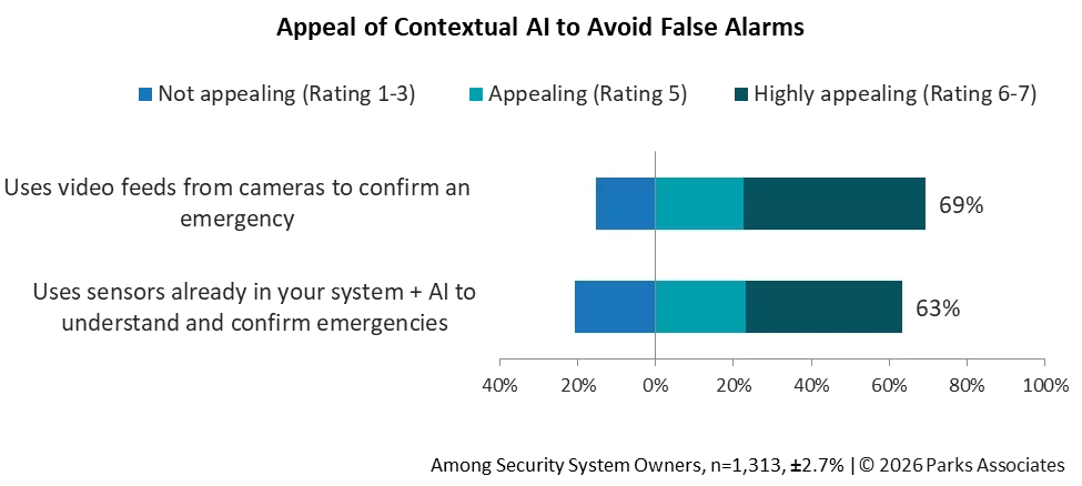63% of security system owners find it appealing for their systems to use information the system captures, plus AI, to understand and confirm emergencies – nearly as many as are interested in using camera feeds.