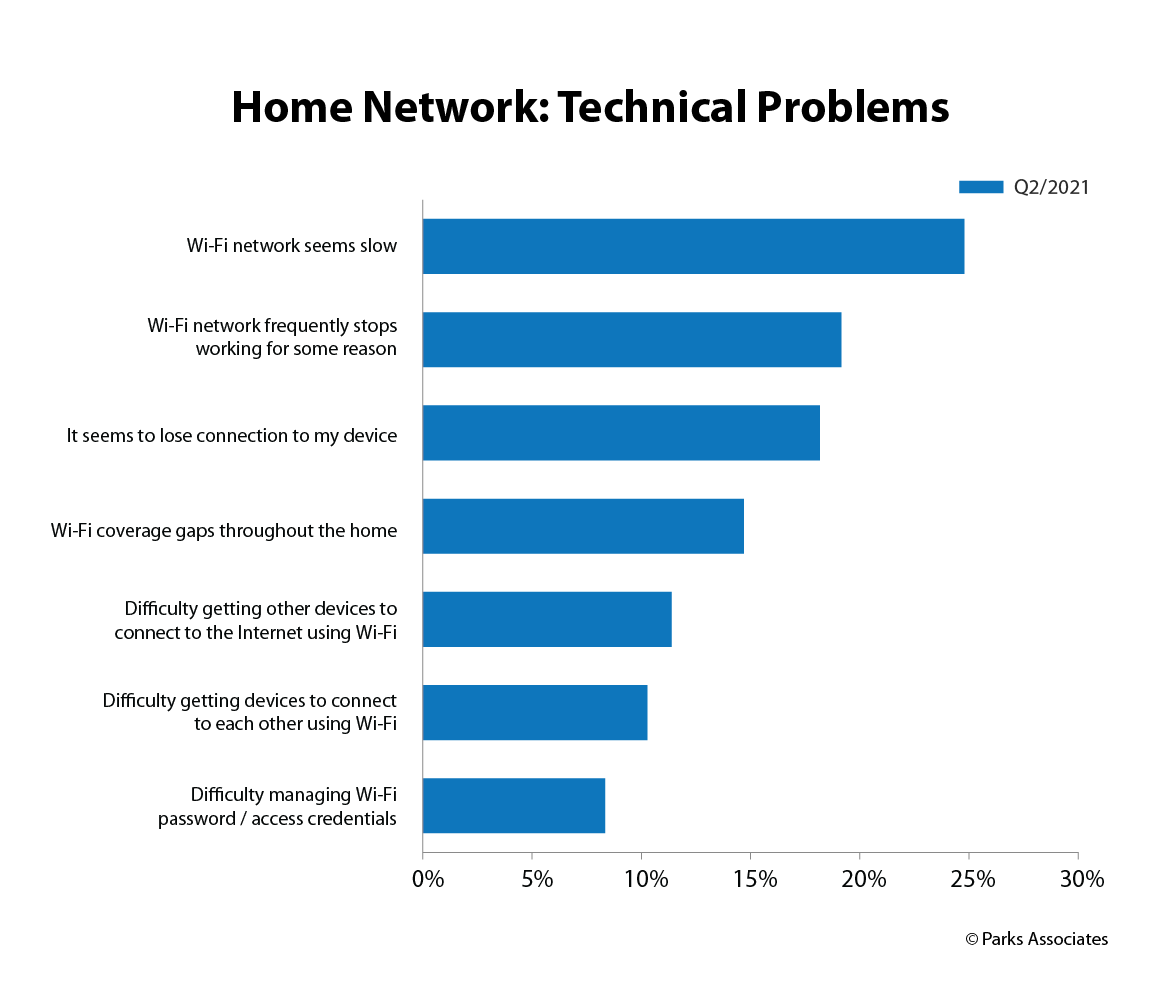 Parks Associates today released the whitepaper Control the Network, Control the Costs: Solving the Wi-Fi Problem in Home Security, developed in partnership with Johnson Controls. New research from Parks Associates shows a growing demand for smart home products through security system providers, but technical challenges with Wi-Fi are pervasive. Fifty-one percent of smart home device owners report they experienced a loss of wireless connectivity.