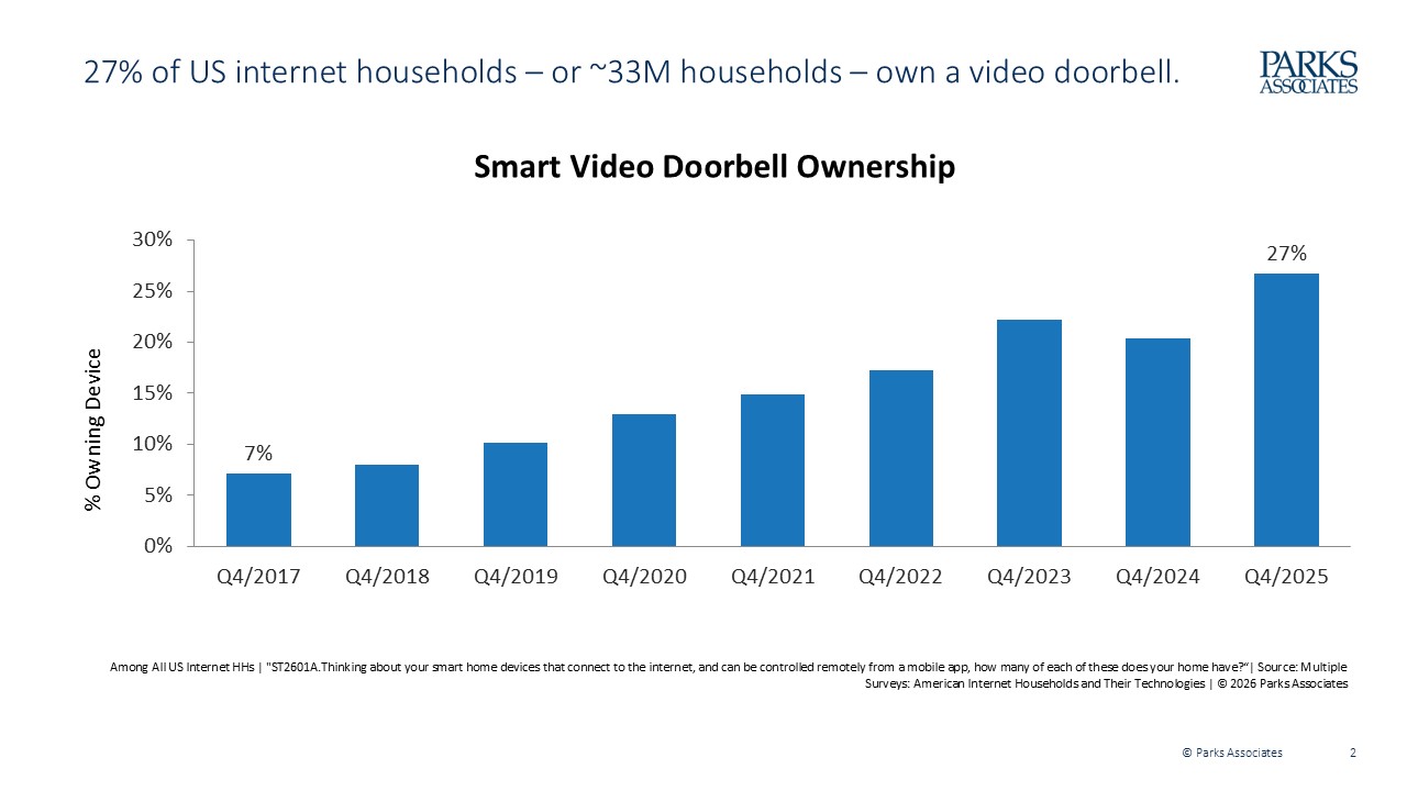 Video doorbells have moved from niche gadget to mainstream infrastructure. According to Parks Associates research, twenty-seven percent of U.S. internet households, or roughly 33 million homes, own a video doorbell. Smart video products, including cameras and video doorbells, represent the fastest-growing and most widely adopted smart home security devices.